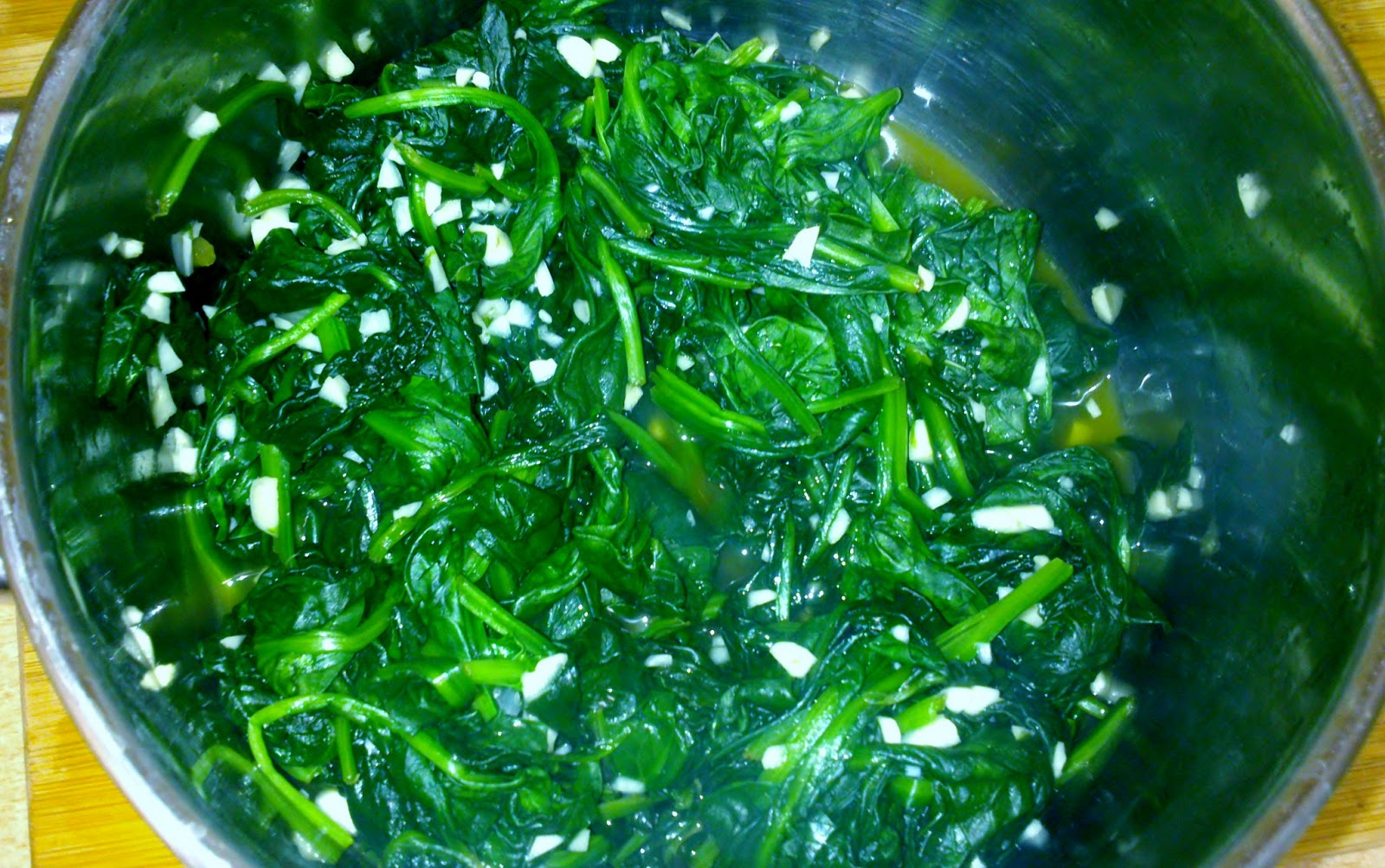 9. Add spinach to pot, add a tablespoon or two of water for the steam to quickly cook the spinach.