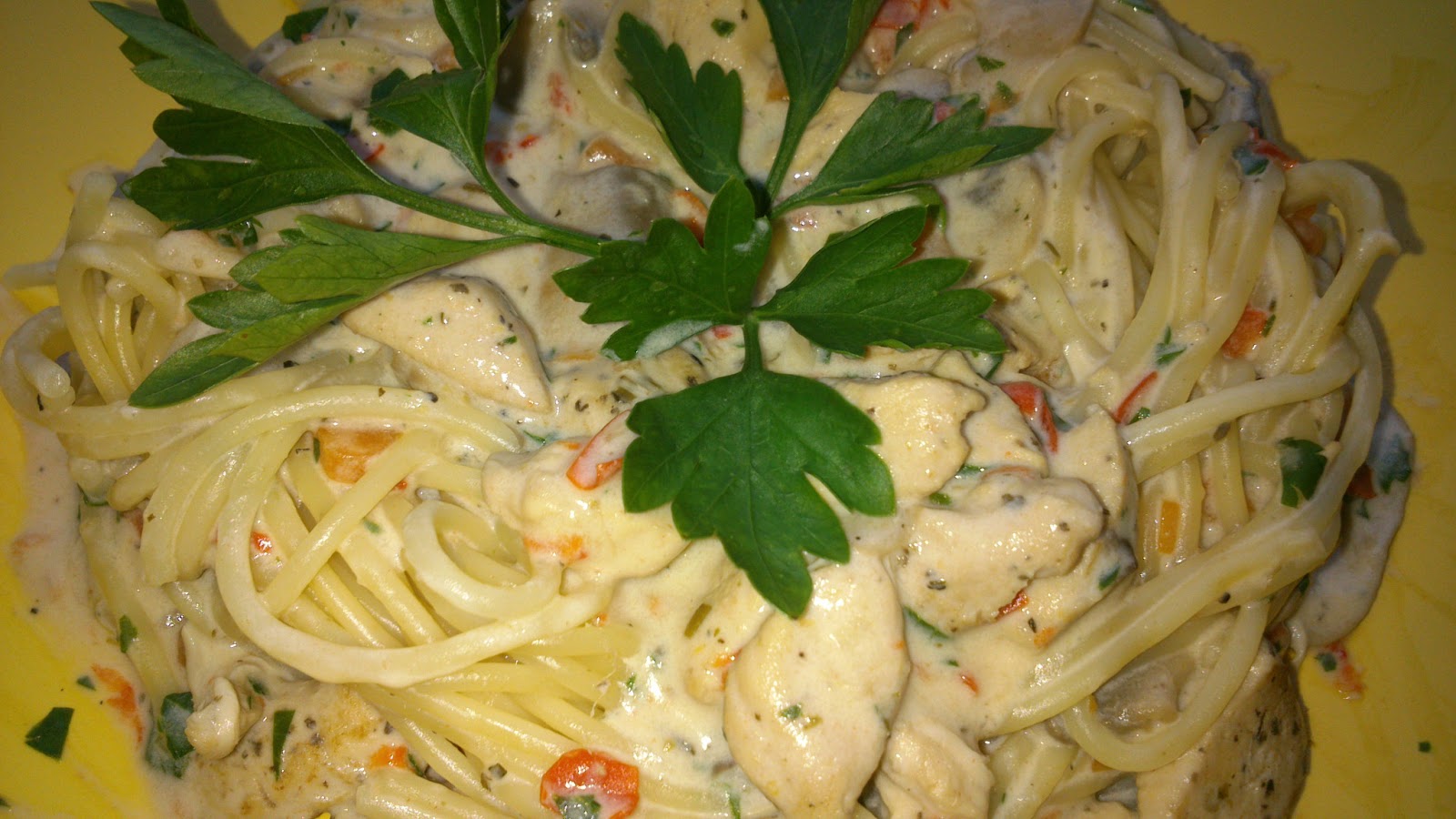 24. Serve spaghetti pasta with chicken cream sauce. Garnish with parsley.